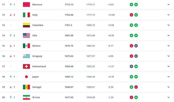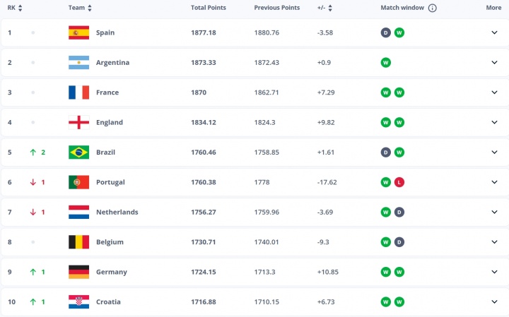 2025-11-20 00:00:23FIFA最新排名:西班牙、阿根廷前2,巴西升至第5,意大利跌至第12