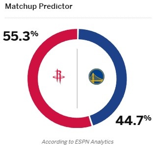 今日ESPN晒出本场胜率预测,火箭为55.3%,勇士则是44.7%。