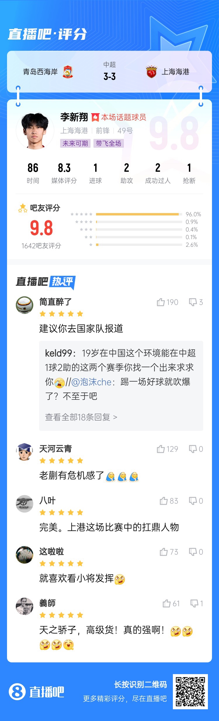 19岁的海港“小孩哥”中超首次先发1射2传,让卫冕冠军极限客场战平西海岸,似乎又让球迷看到了一颗未来冉冉升起的新星,看到新的希望!